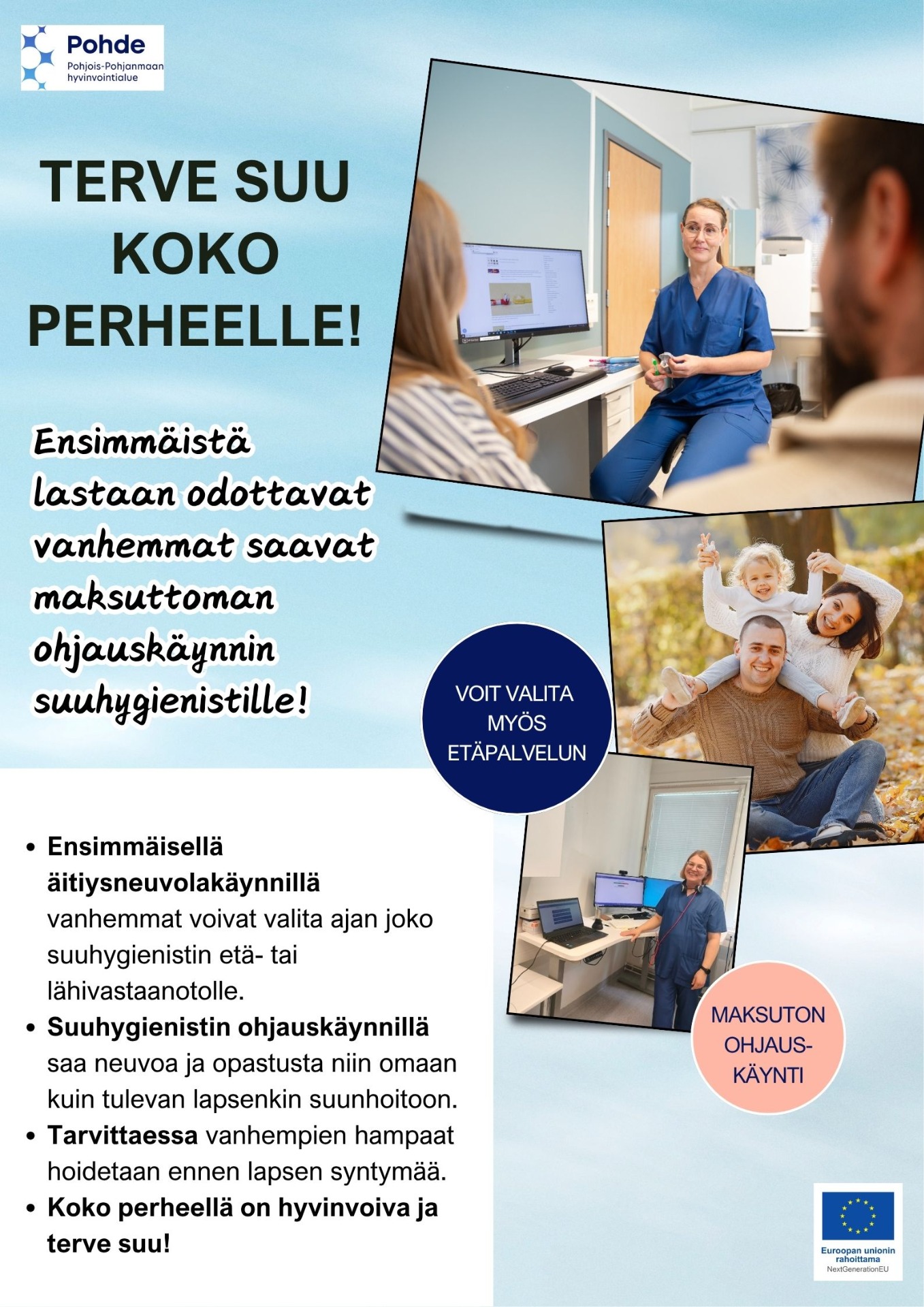 Suunnittelimme mallin, jossa jo ensimmäisellä äitiysneuvolakäynnillä vanhemmat voivat valita ajan joko suuhygienistin etä- tai lähivastaanotolle. Maksuttomalla suuhygienistin ohjauskäynnillä vanhemmat saavat opastusta niin omaan kuin tulevan lapsenkin suunhoitoon. Tarvittaessa vanhempien hampaat hoidetaan ennen lapsen syntymää. Toimintamallin tavoitteena on oikea-aikainen ohjautuminen, hoitoon pääsy ja ohjaus.
